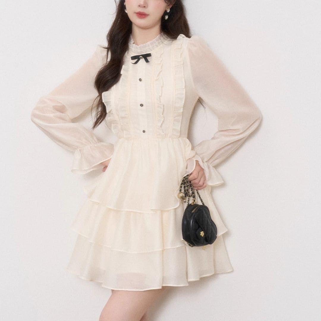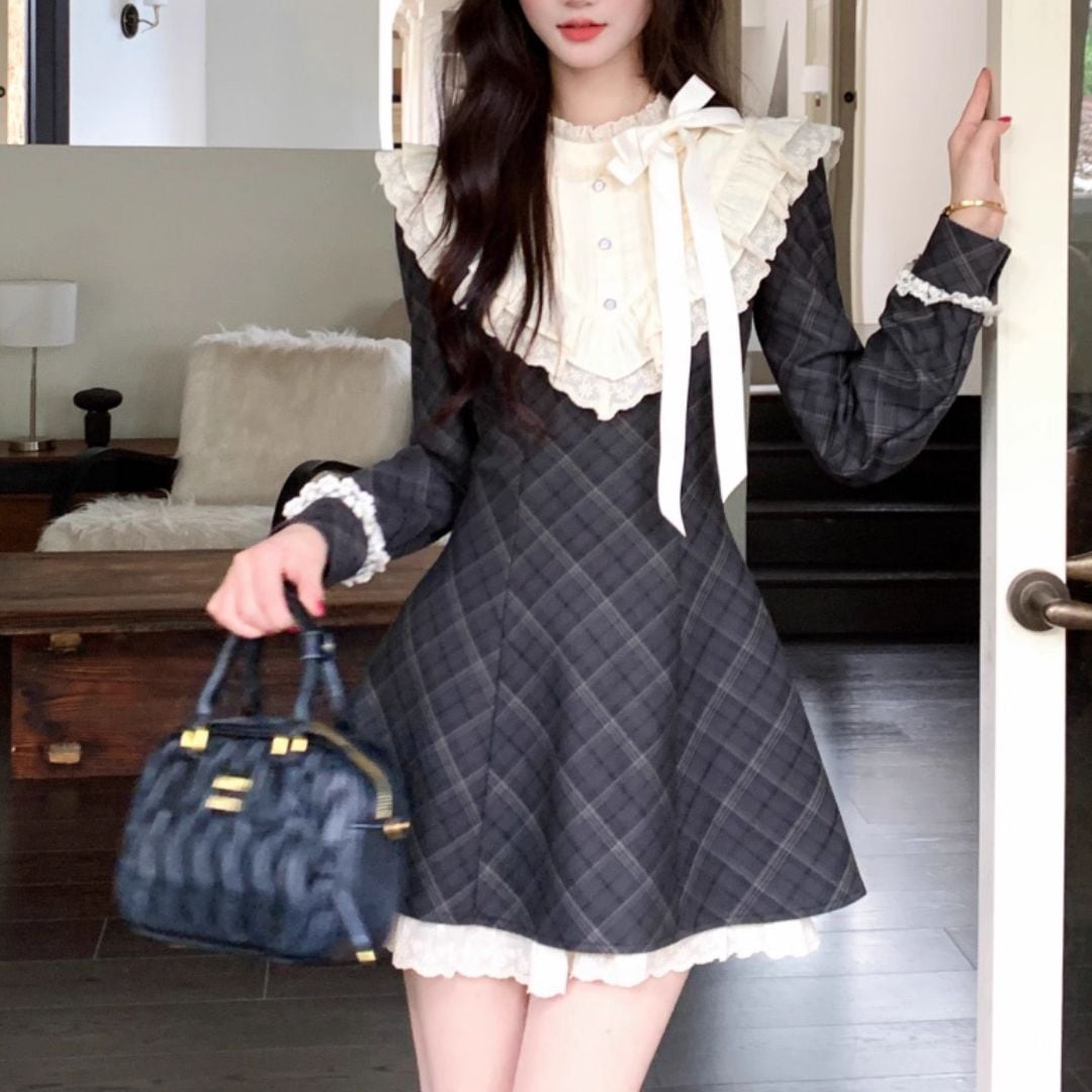 コーヒーチェックフリルカラーワンピース(NO.070815)